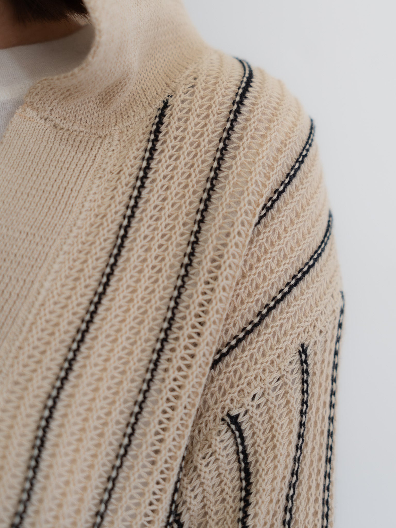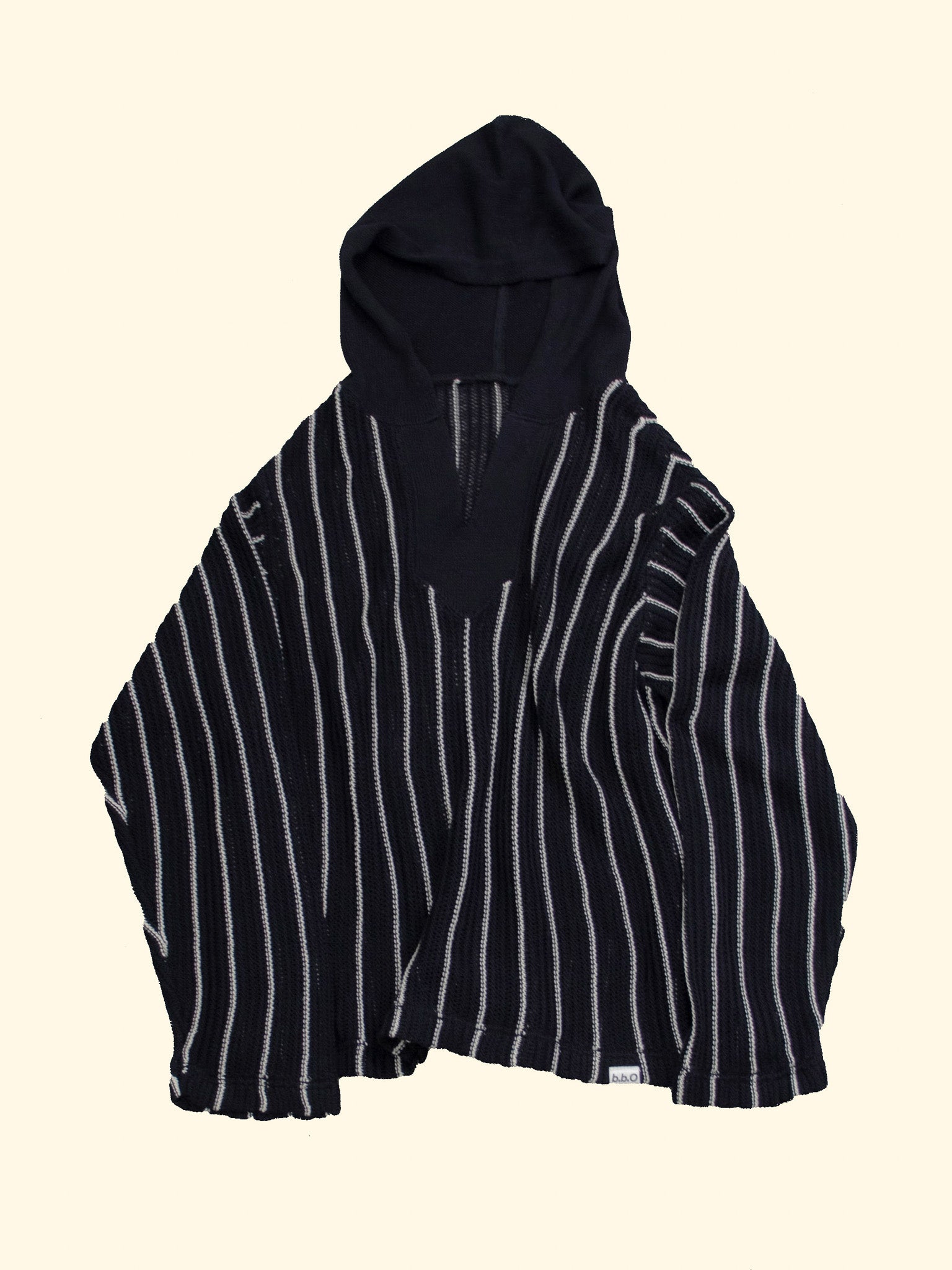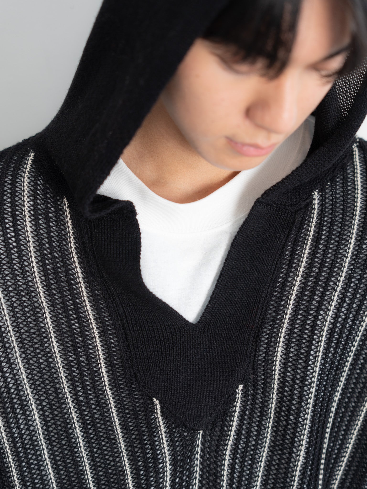ストライプ柄を落とし込んだ、メキシカンパーカー風デザインが目を引く、b.b.Oのニットパーカー。