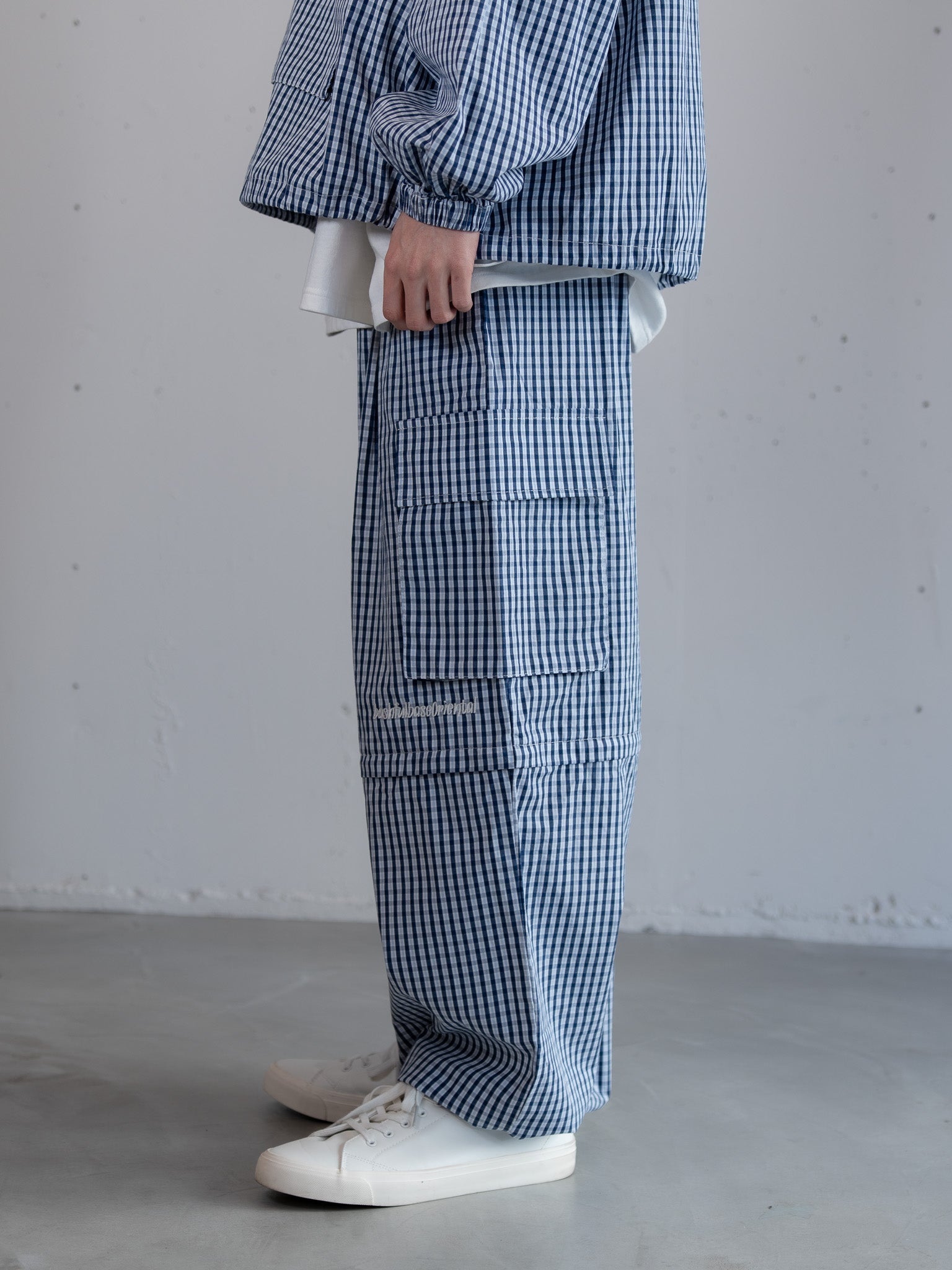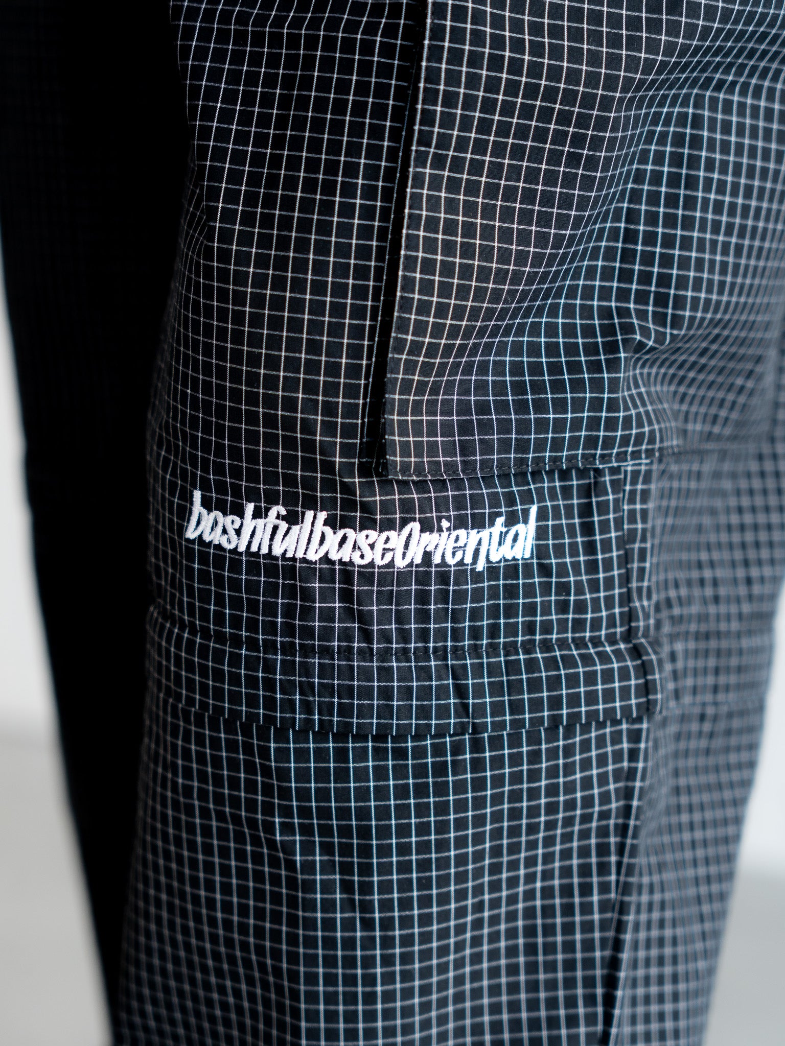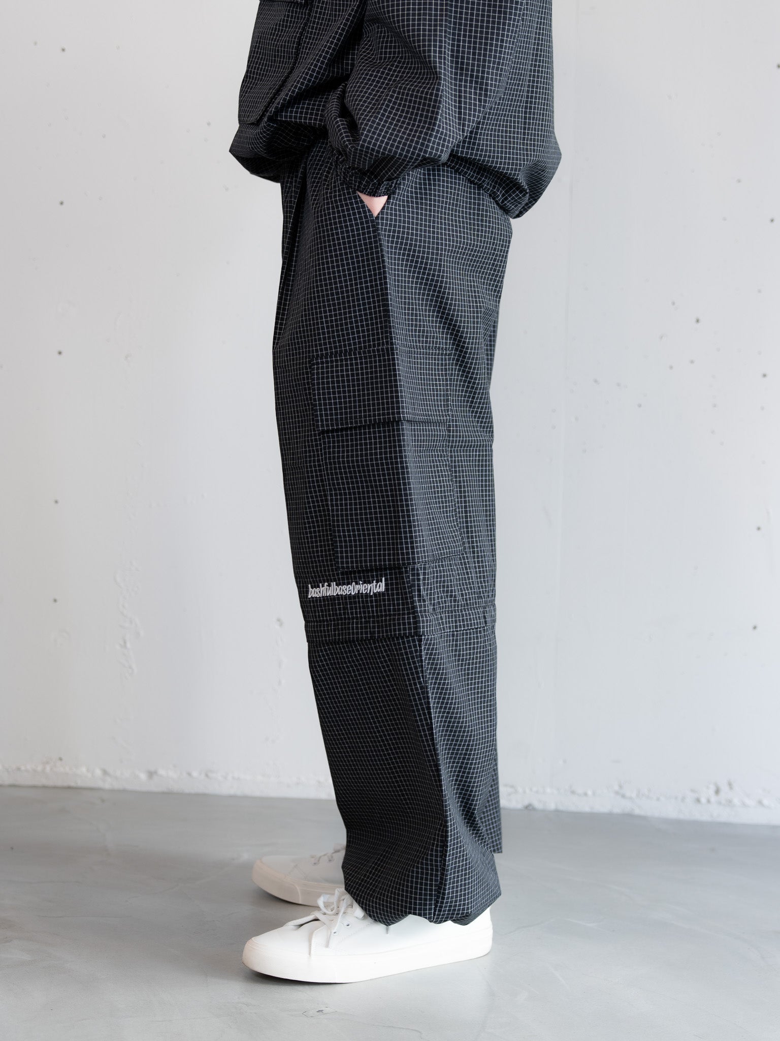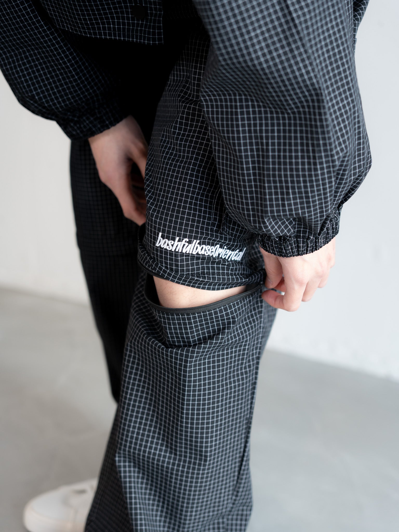 膝付近、ジップの上部分には bashful base Oriental の刺繍ロゴを配置し、さりげないアクセントに。
