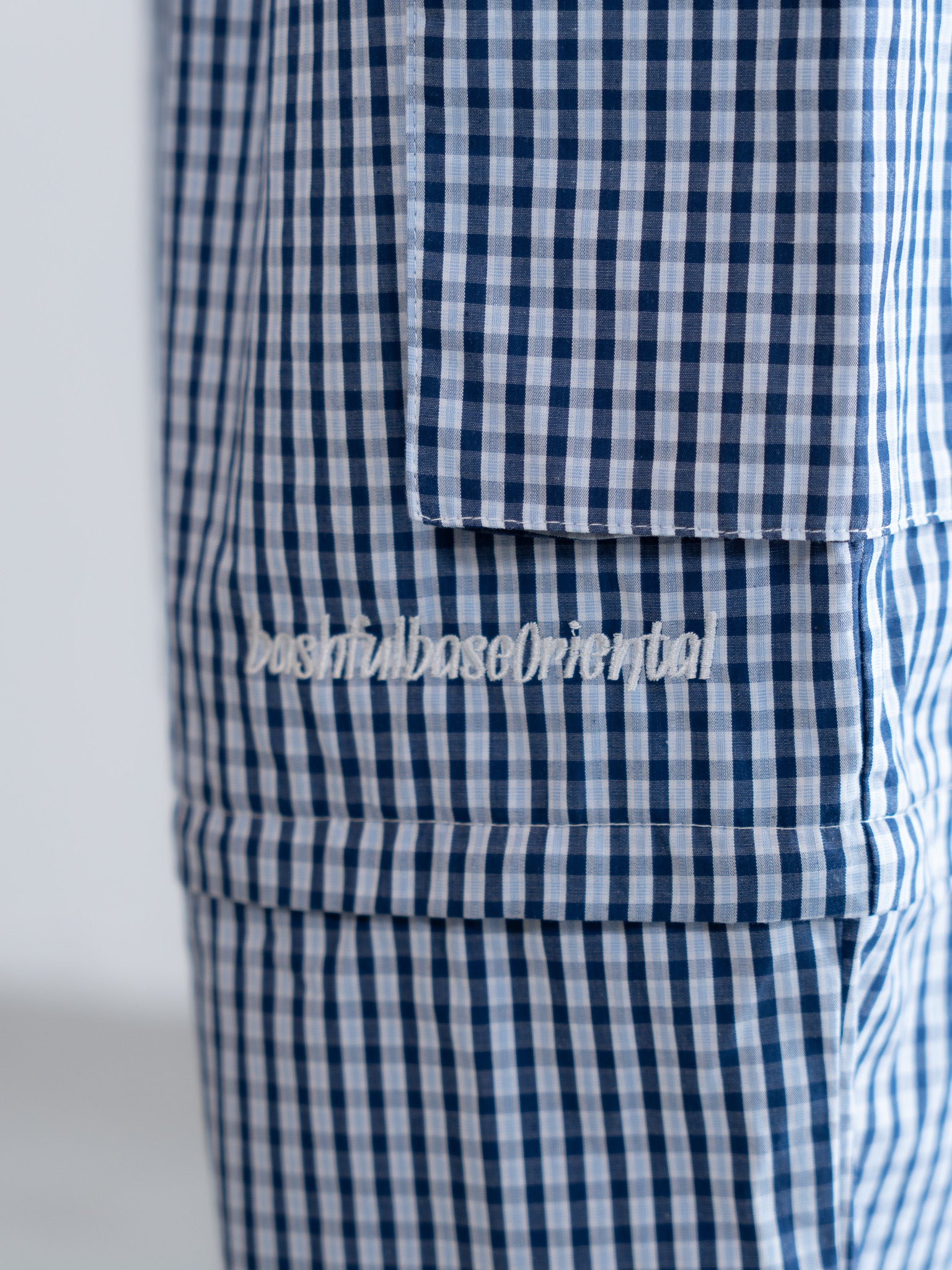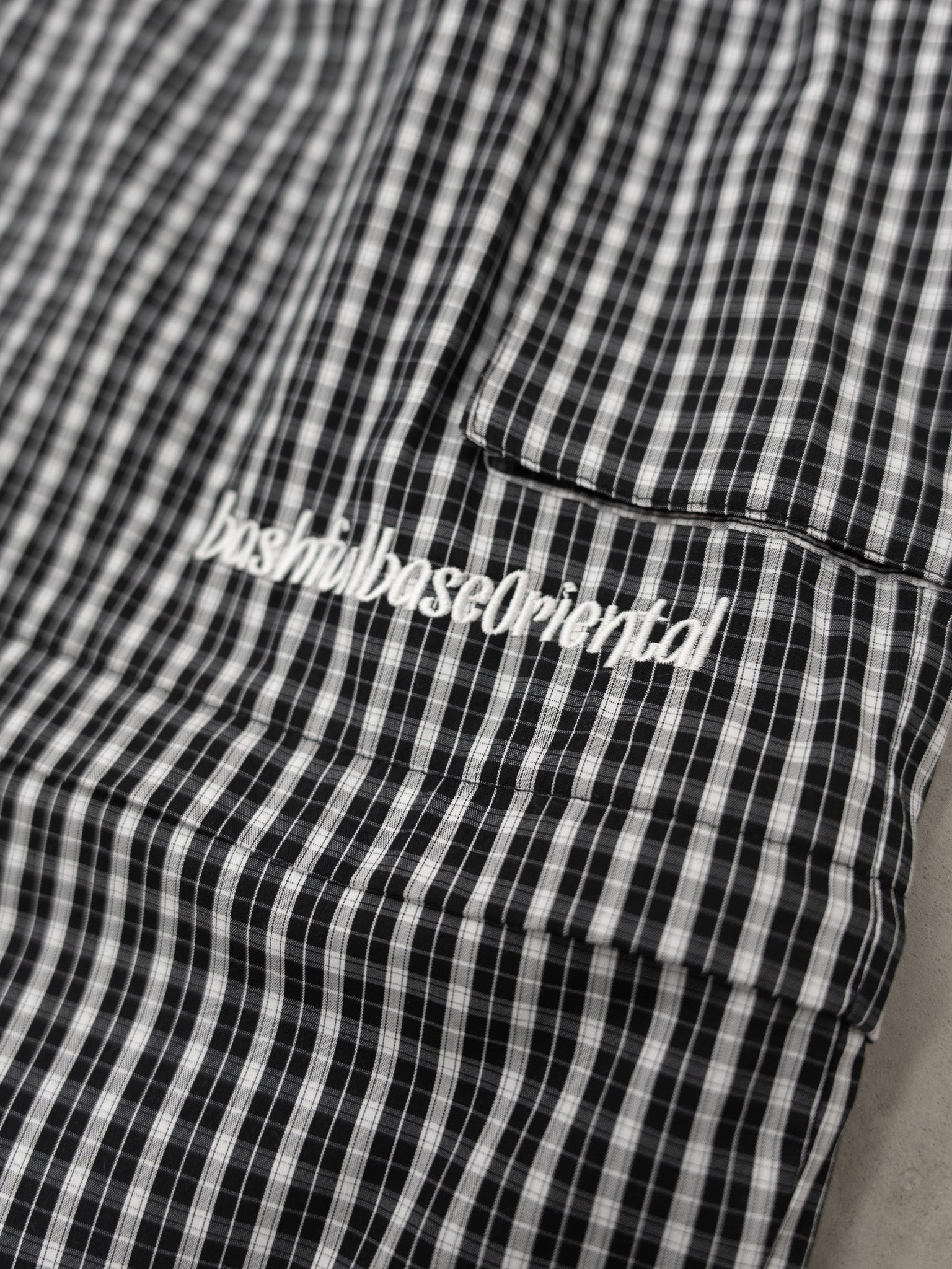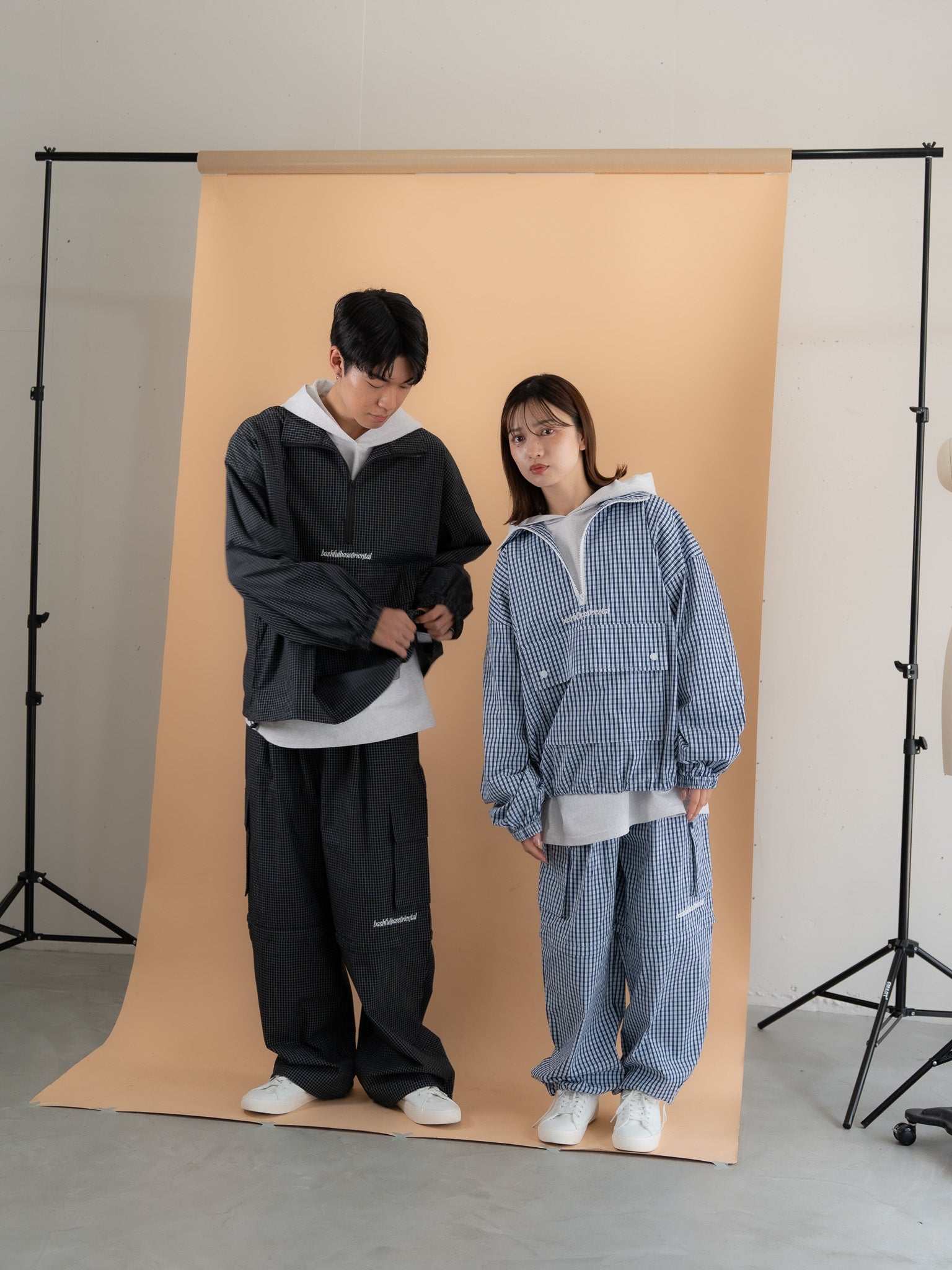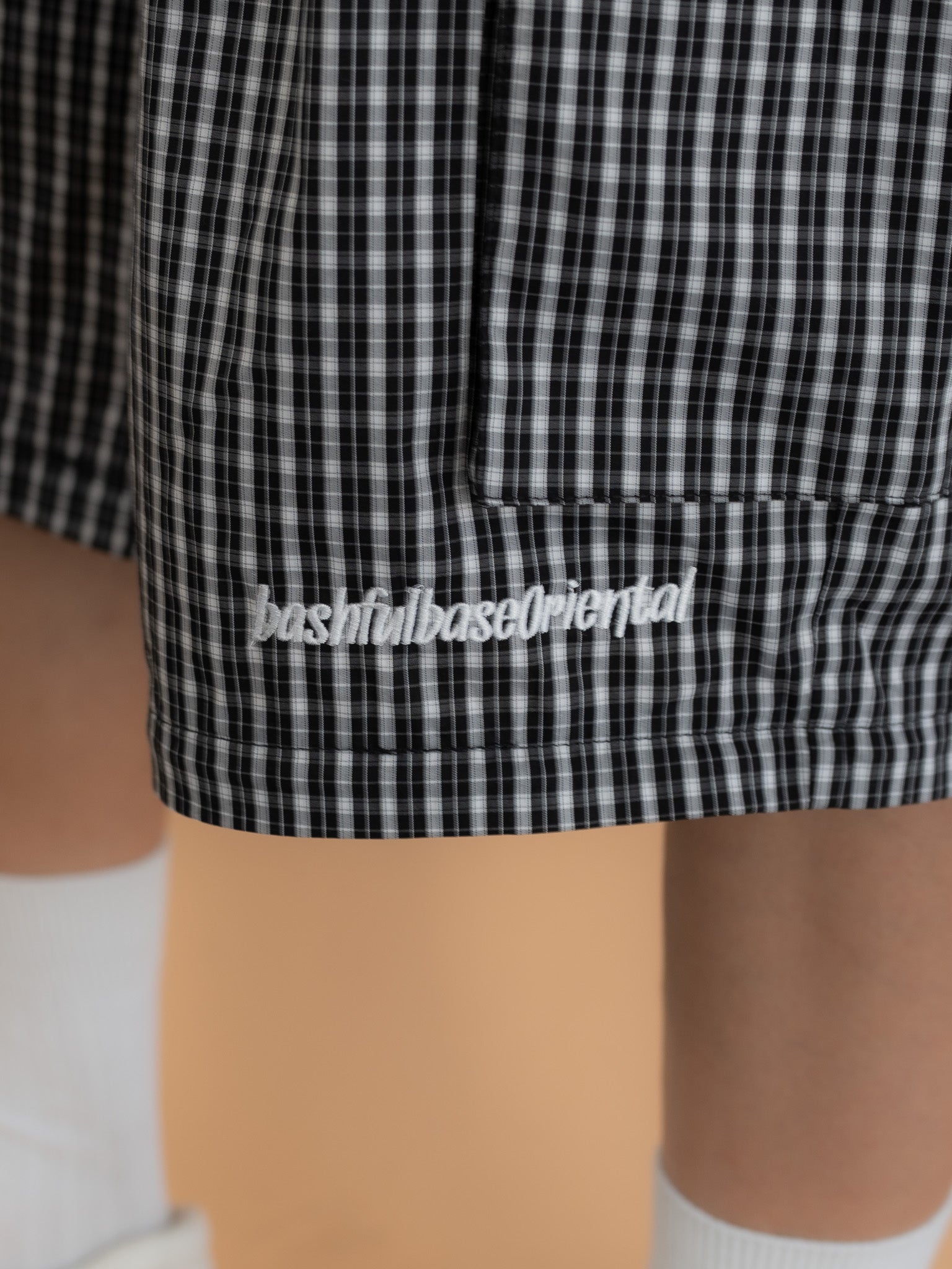 膝付近、ジップの上部分には bashful base Oriental の刺繍ロゴを配置し、さりげないアクセントに。