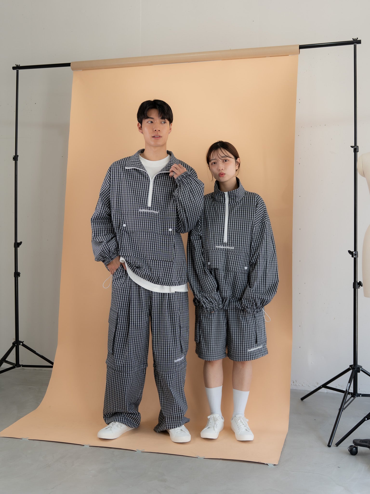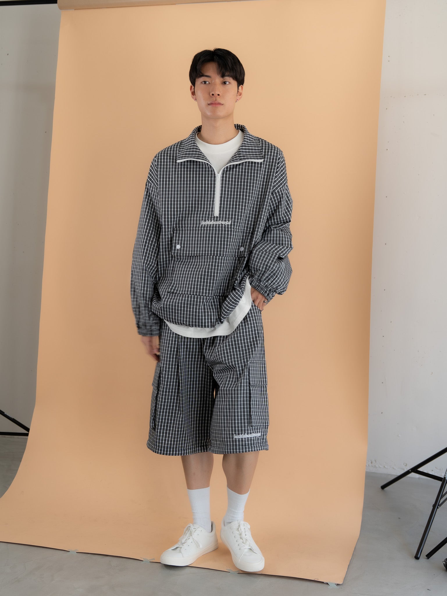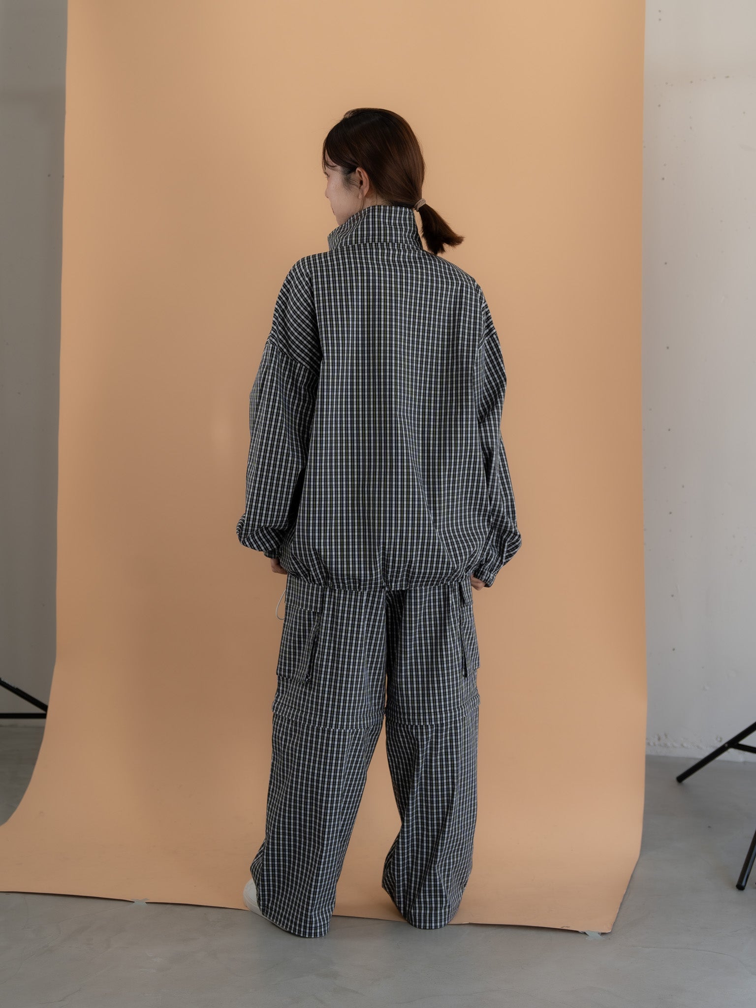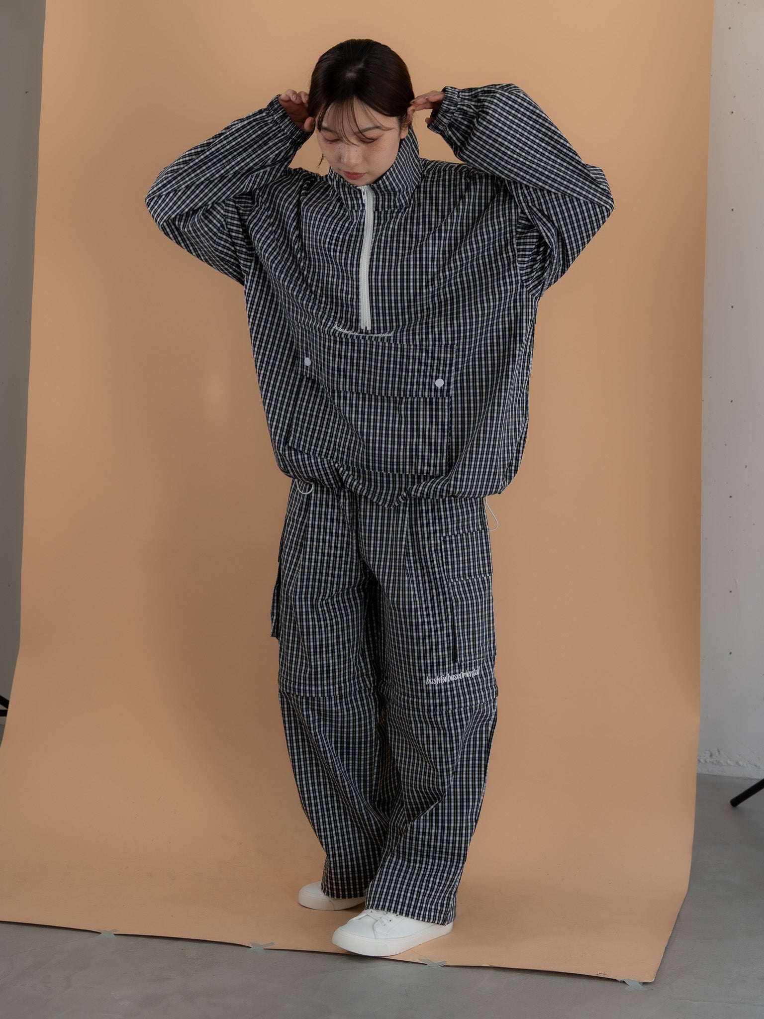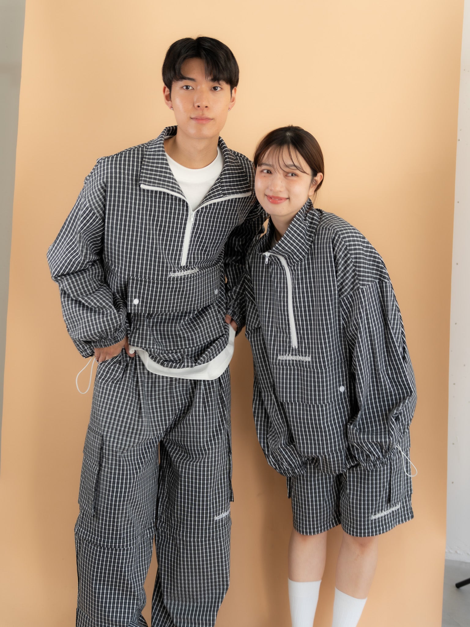 [SET]チェック柄ハーフジップアノラック+チェック柄2WAYカーゴポケットパンツ(2set)