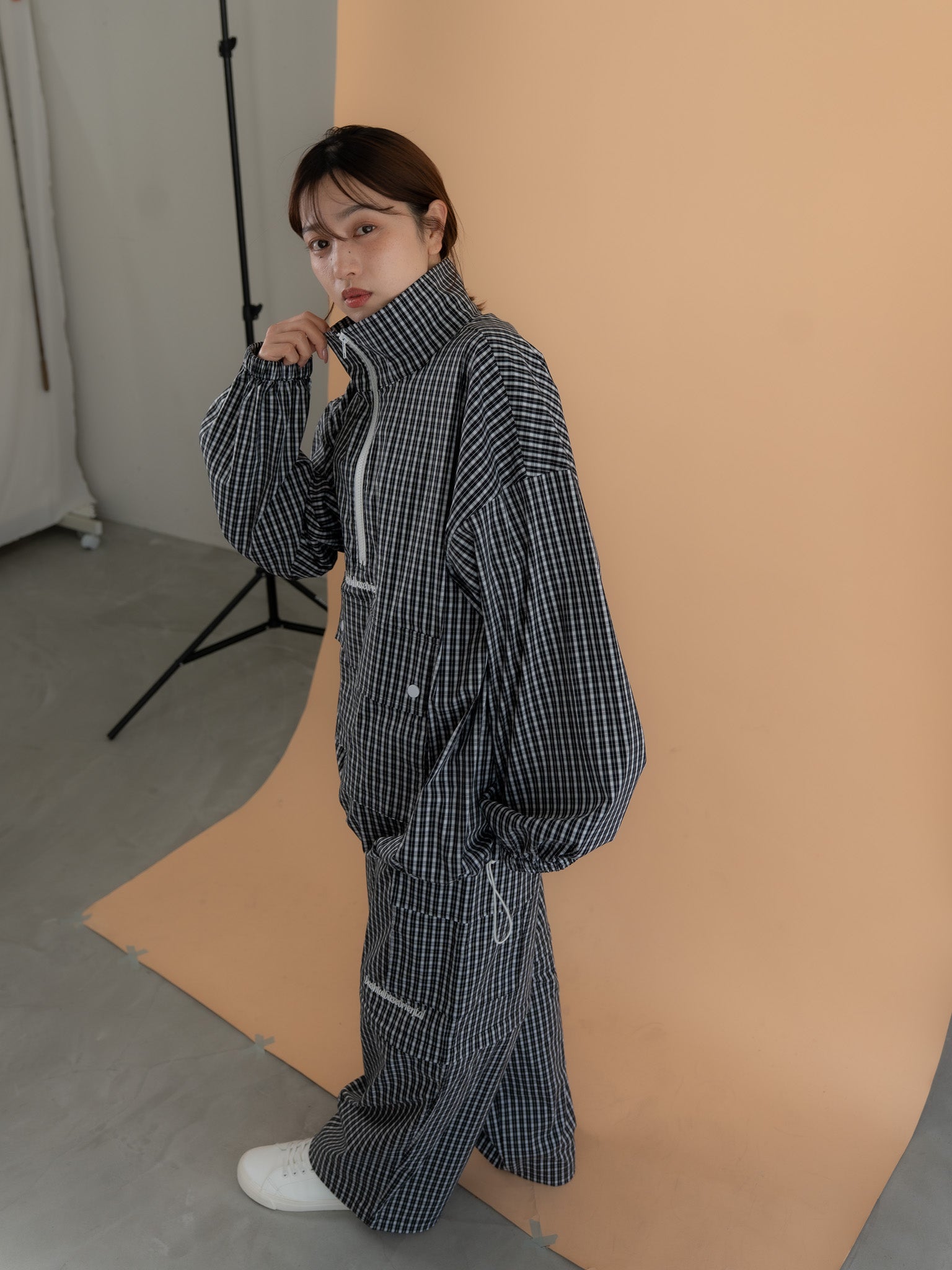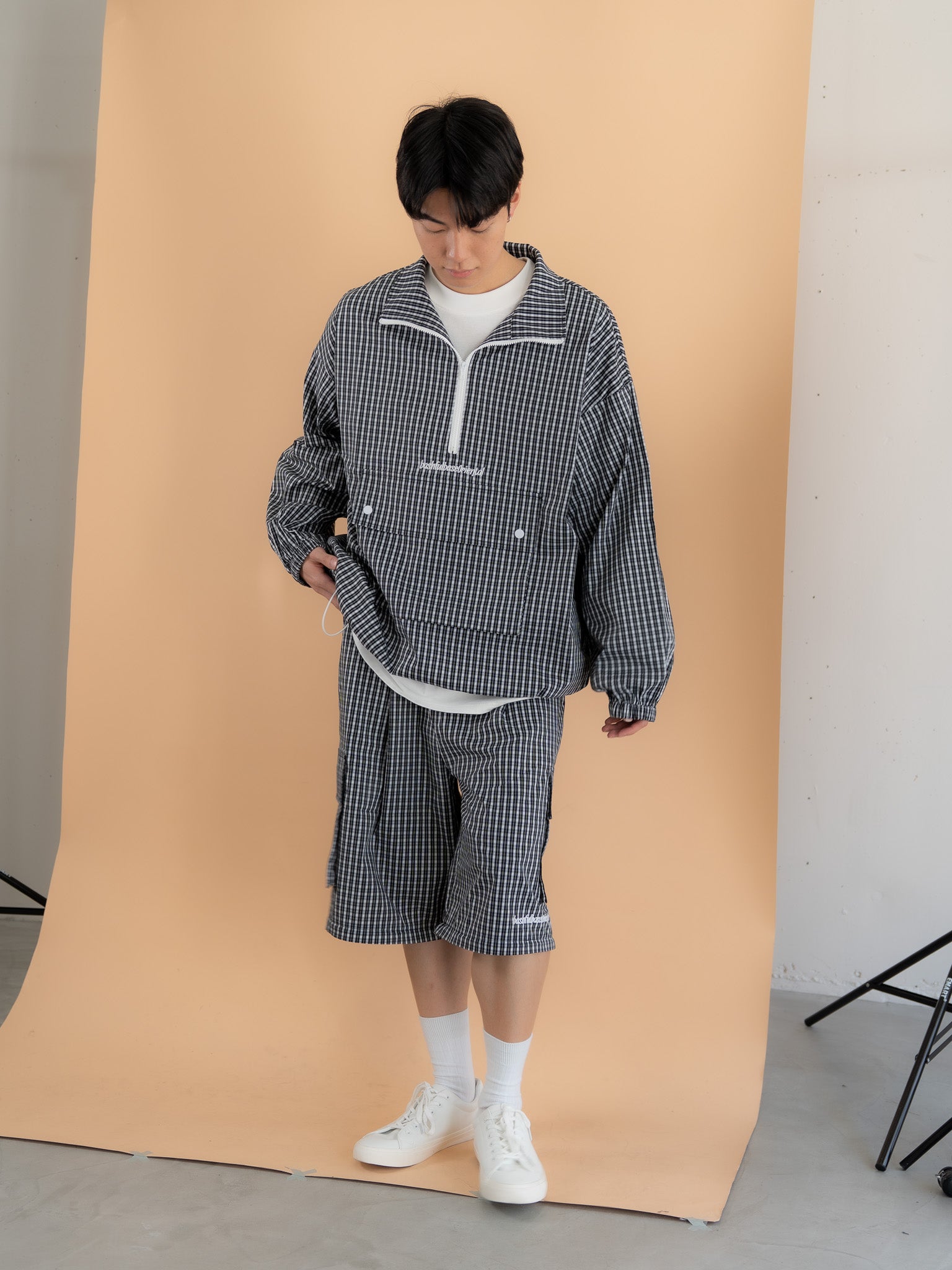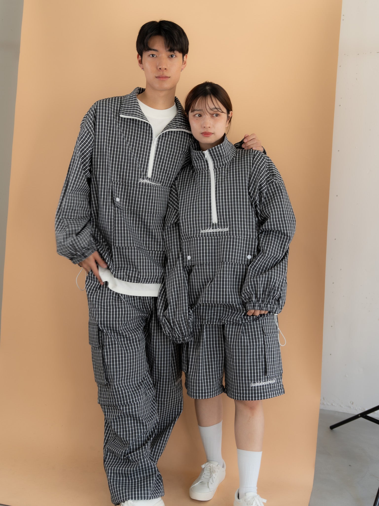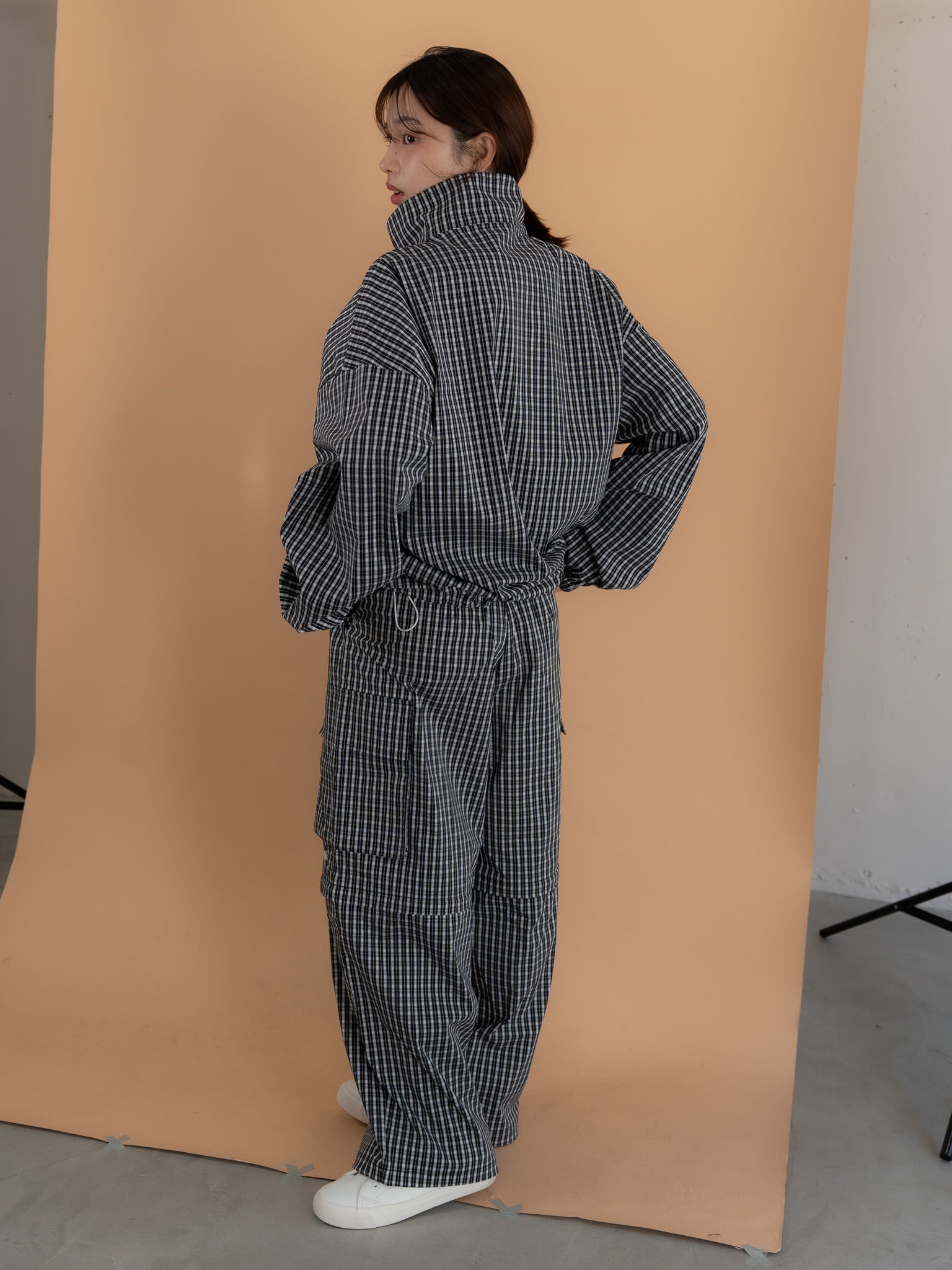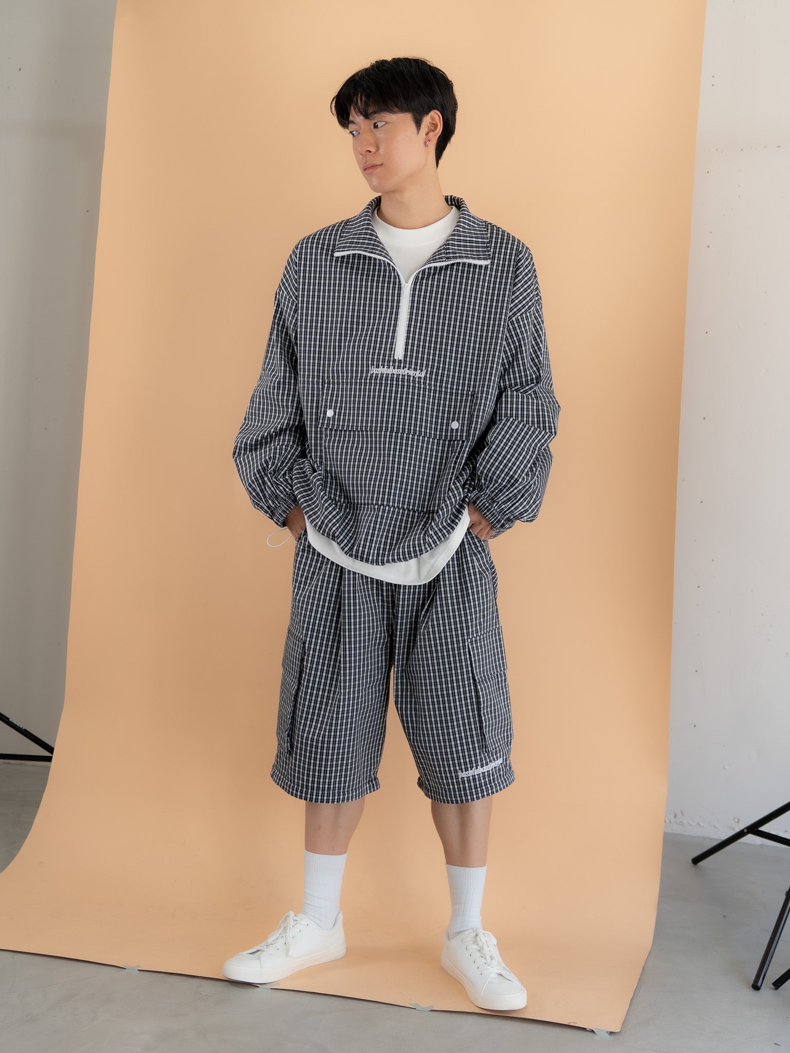 [SET]チェック柄ハーフジップアノラック+チェック柄2WAYカーゴポケットパンツ(2set)