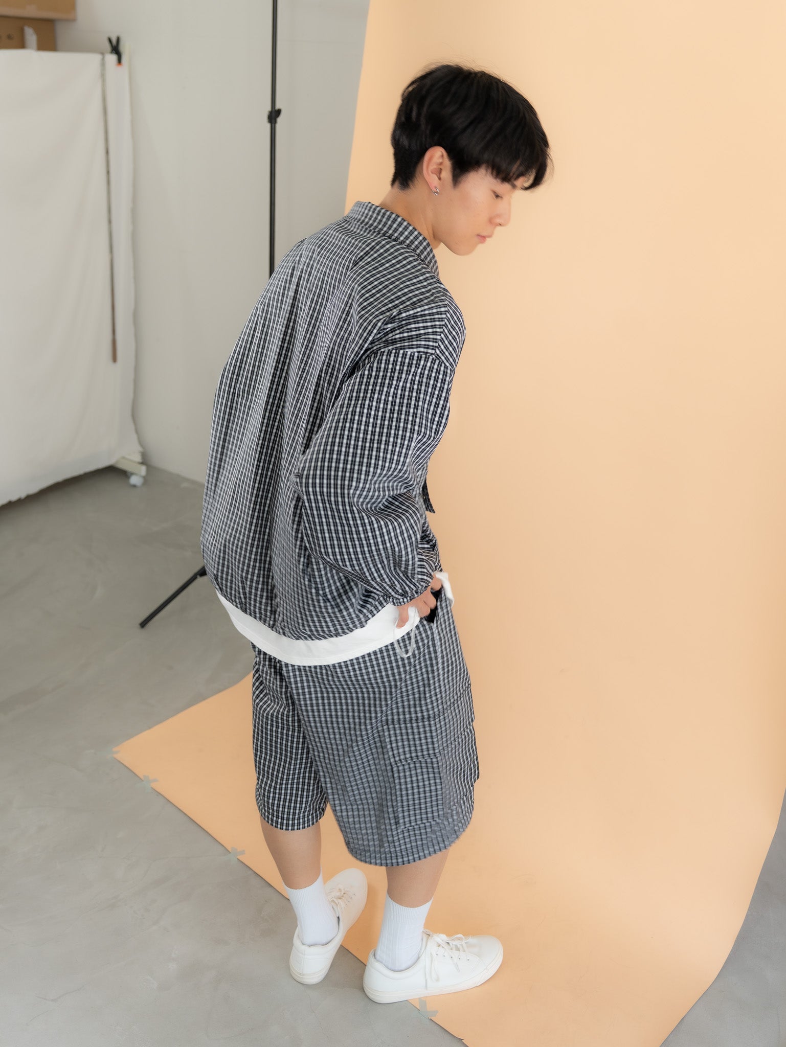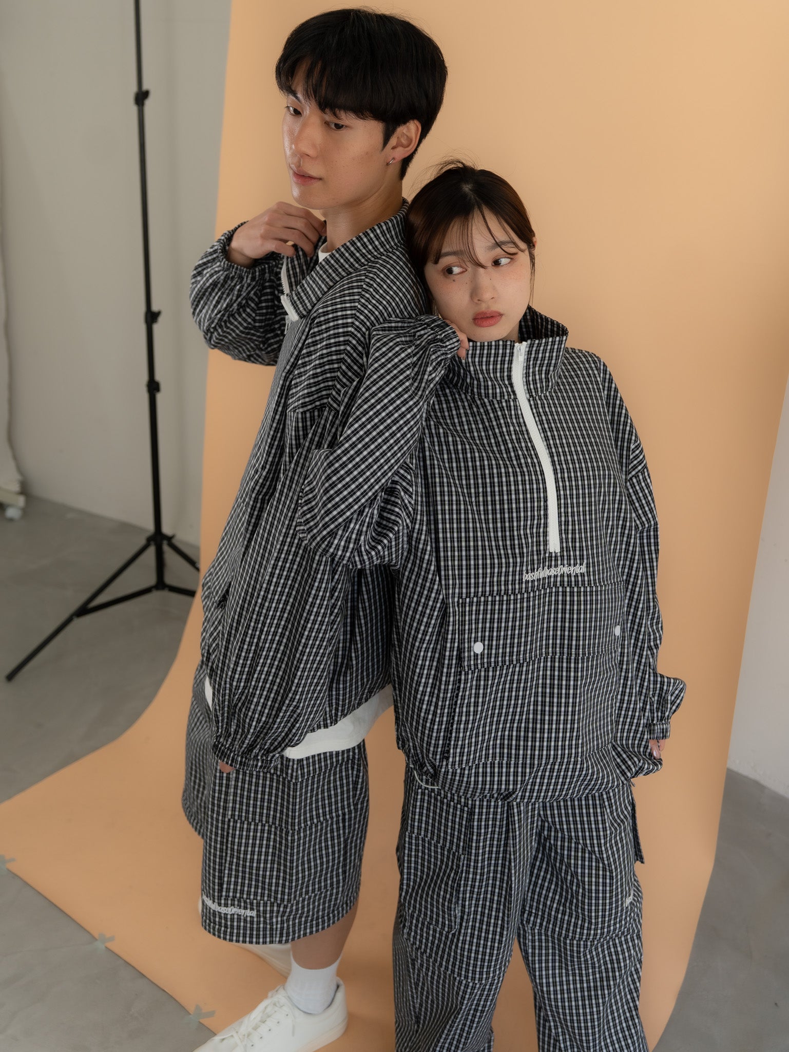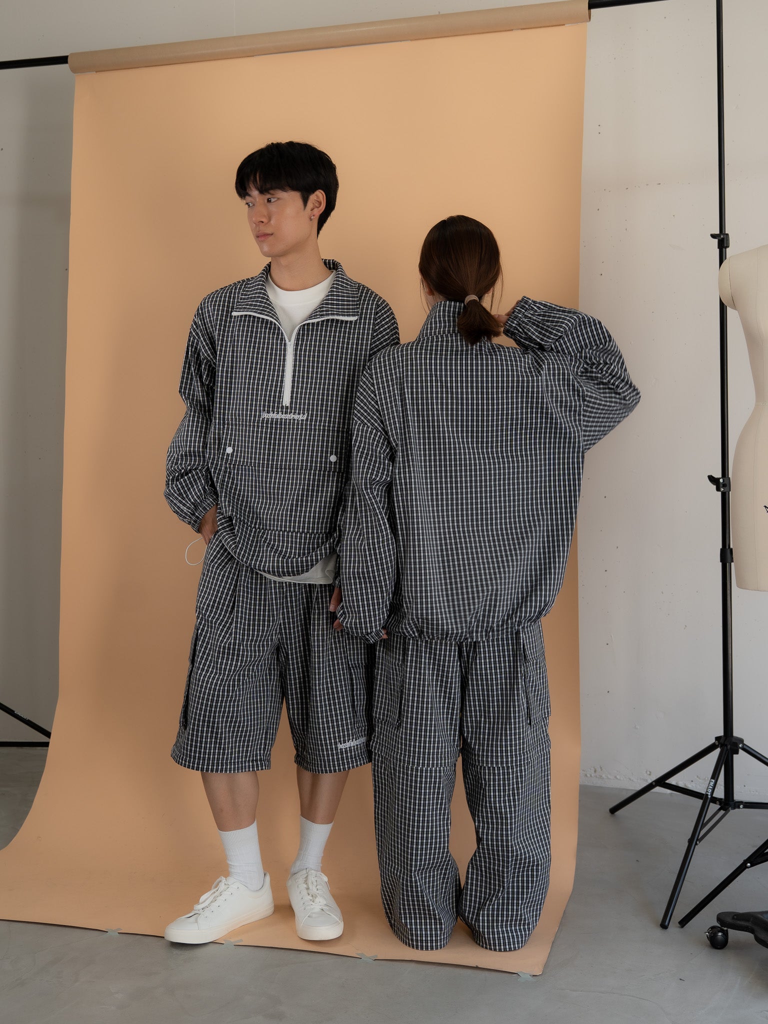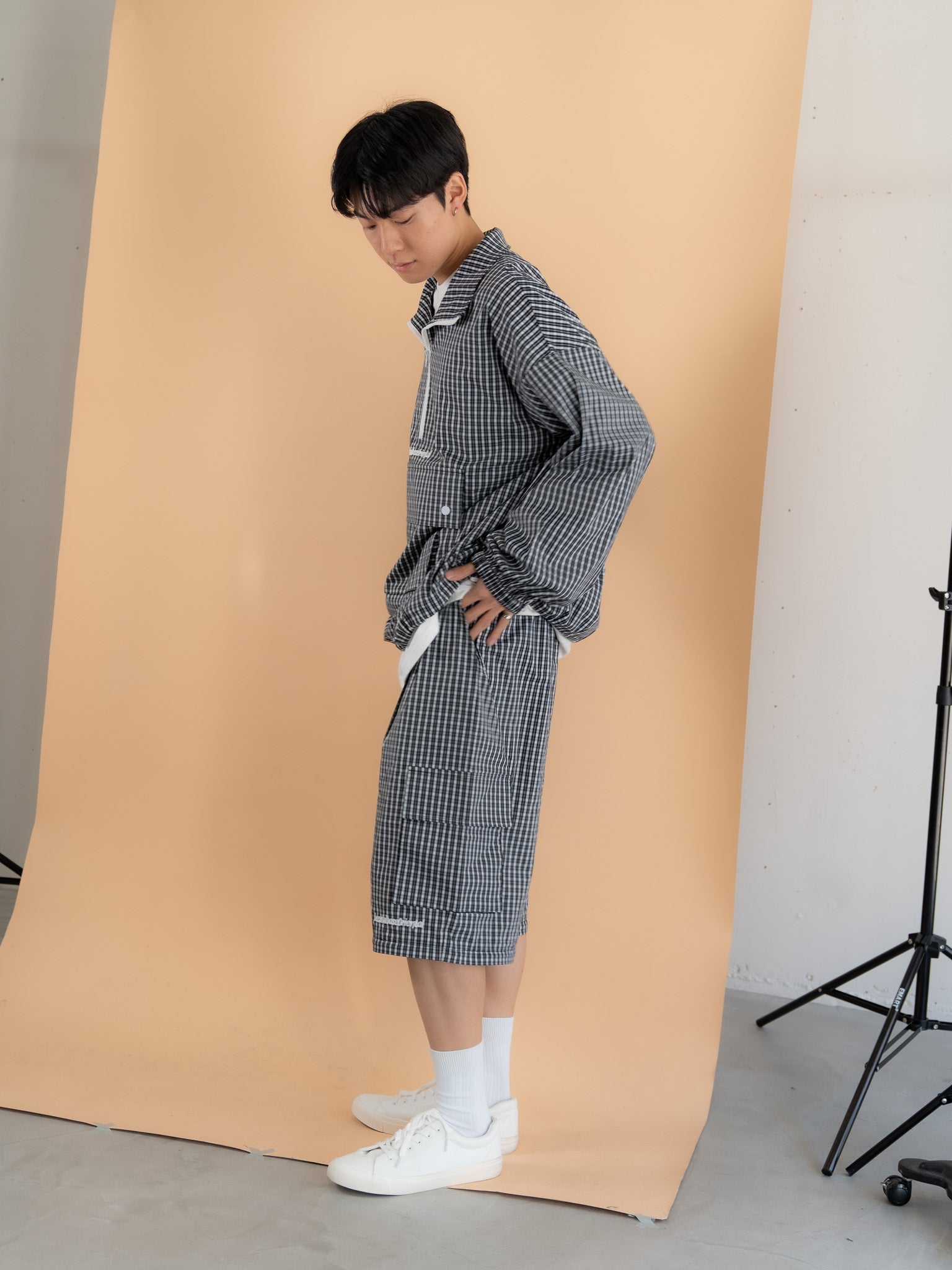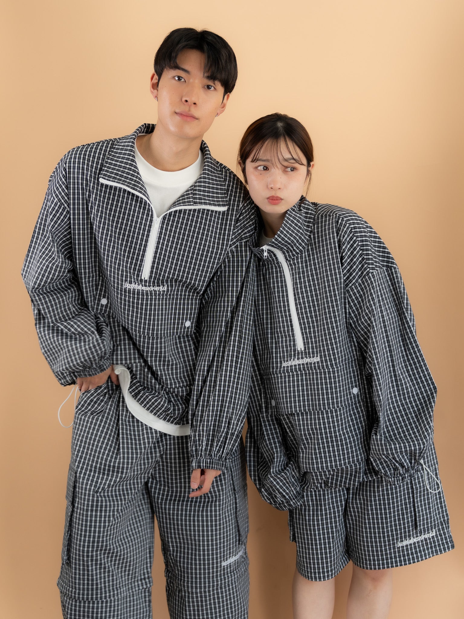 [SET]チェック柄ハーフジップアノラック+チェック柄2WAYカーゴポケットパンツ(2set)